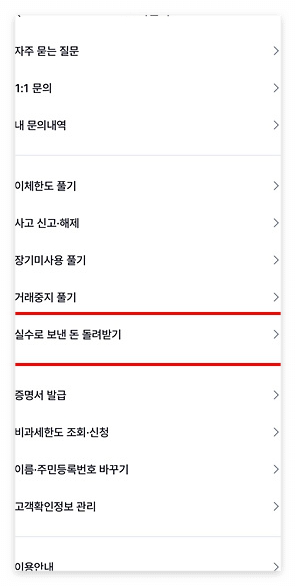 - ‘고객센터’ → ‘실수로 보낸 돈 돌려받기’ 메뉴 선택
